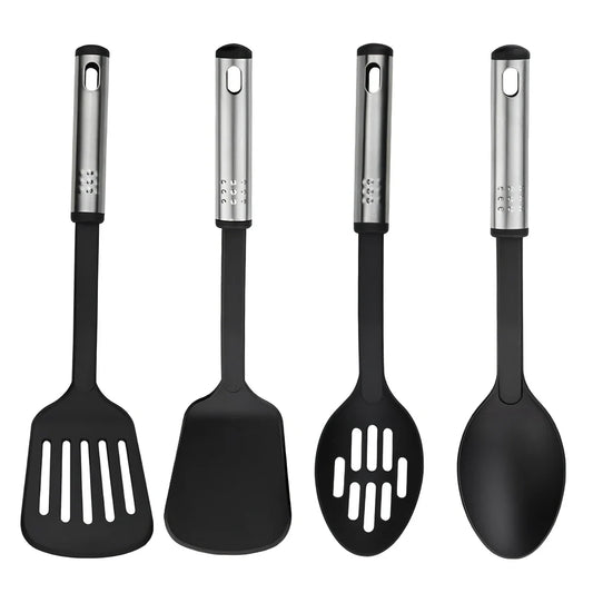 25-piece kitchen utensil set with silicone heads and stainless steel handles featuring hanging hole storage design for organised kitchen drawers