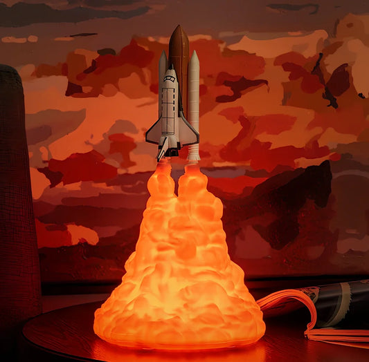 3D printed rocket space shuttle lamp with realistic launch scene details, featuring a 9-11 inch size range, 800mAh battery lasting 6-10 hours, and 2000-hour LED lifespan for reliable night lighting and decoration