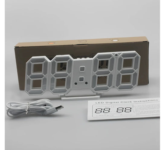 3D LED wall digital clock with four brightness levels displays time, date, temperature, and features adjustable alarm with snooze function for versatile home or office use