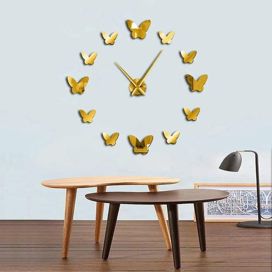 3D mirror wall clock featuring butterfly design with sweep second movement, powered by AA batteries, measuring 30cm diameter with plastic mirror surface for living room and bedroom decor