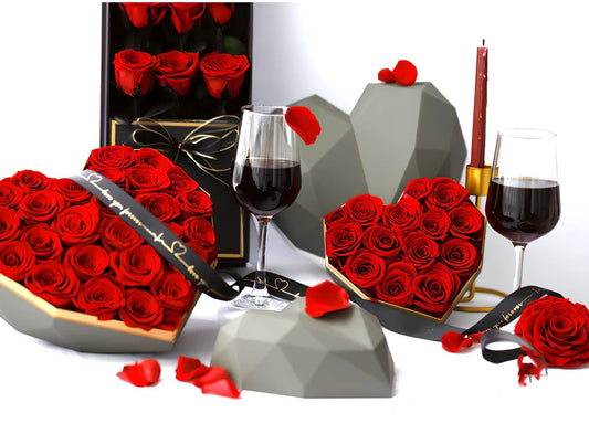 Valentine's Day Gift Box with Preserved Silk Flowers and Roses in Pink or Red