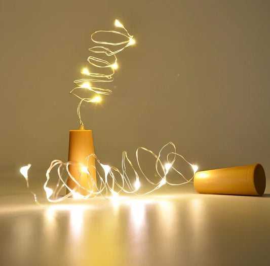 Wine bottle LED string lights with 2-metre copper wire and 20 warm white LEDs for decorative bottle illumination, featuring IP65 waterproof rating and flexible wire that conforms to bottle shapes