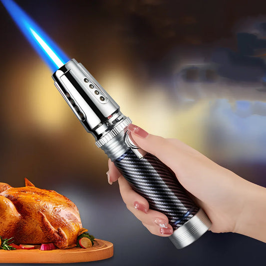 Windproof electronic inflatable cigar lighter with 1300°C blue flame temperature, zinc alloy construction weighing 236g, and 180mm length for reliable outdoor ignition in challenging conditions