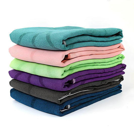 Yoga towel measuring 185cm by 68cm with 3mm thickness microfiber construction for enhanced grip and sweat absorption during yoga practice